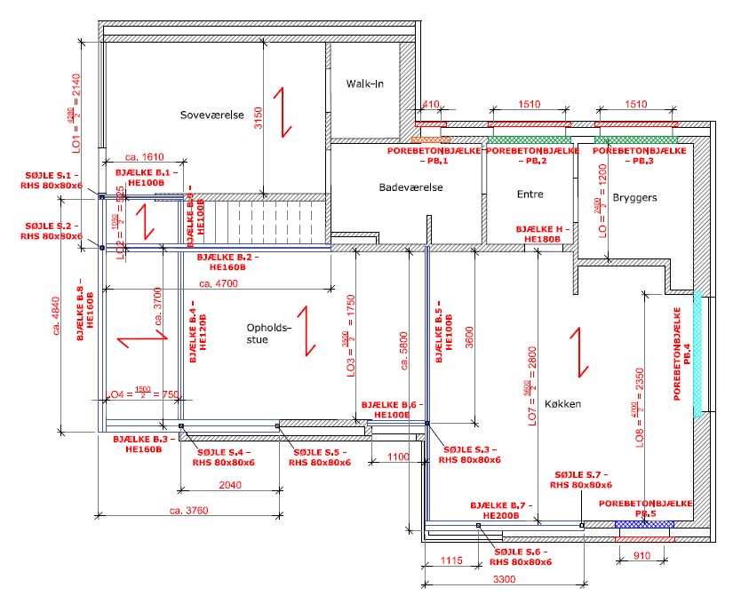 Enfamilieshuset opføres med en hulmursydervæg med en formur af teglsten og en bagmur af gasbetonblokke. Arbejdet omhandler projektering af overliggere i ydervæg samt stabilitet af huset.